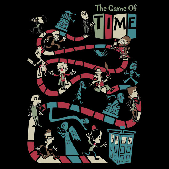 The Game of Time – The family game for every (re)Generation! Featuring all eleven Doctors in the boardgame which is played in a strict progression of cause to effect and not — from a non-linear, non-subjective viewpoint — as big ball of wibbly-wobbly… timey-wimey… stuff. Ironic! Inspired by Doctor Who.