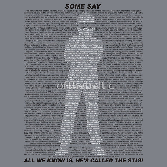 Some say that he works for Top Gear, and that he is always introduced with some strange fact about him. All we know is, he’s called the Stig! This typographic tee features all the Stig facts from seasons 6 to 17 designed in the outline of the Stig.