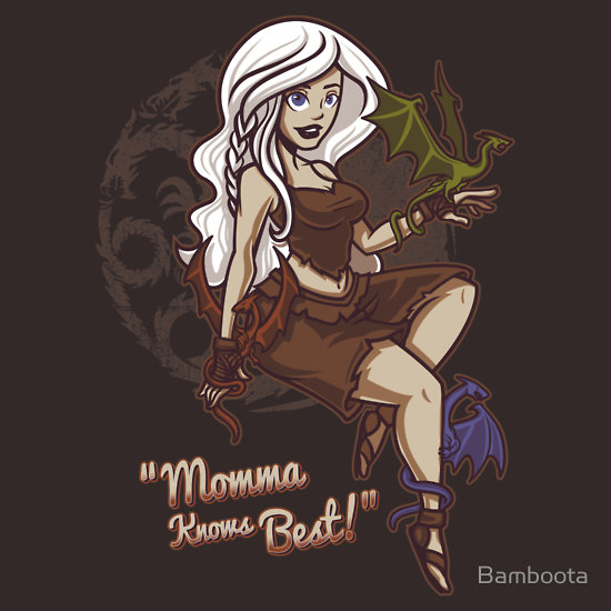 Khaleesi in the streets, dragon in the sheets – Daenerys Targaryen is one hot Dragon momma. With a brood of adopted kids she’s the Anglina Jolie of Westeros, and no one messes with her babies. Inspired by Game of Thrones / A Song of Ice and Fire.