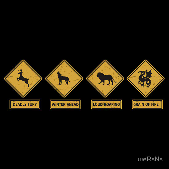 Westeros can be a dangerous place. It’s a good thing there are warning signs about to warn of the oncoming dangers. Featuring the emblems of some of the great houses from Game of Thrones / A Song of Ice and Fire as road signs.