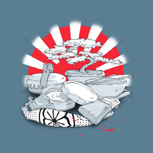 A paint brush. A bonsai tree. A pair of chopsticks. A tin of wax. A headband. A dojo logo. A drum. Everything you need- minus a small Okinawan man – to master the art of Karate. Inspired by the movie – the original movie – The Karate Kid.